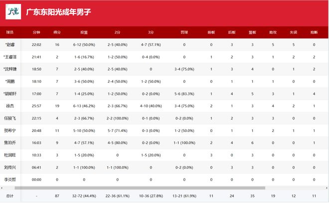 全场数据,徐杰19分4助攻、赵睿16分3篮板5助攻,贺希宁11分、焦泊乔9分6篮板;山东方面,陶汉林22分12篮板,王岚嵚14分4篮板4助攻3抢断、李祥波10分7篮板4助攻。
