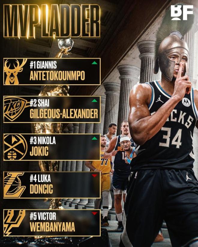 凭借这样的表现,字母哥在美媒《BF》公布的最新一期MVP榜单中力压亚历山大高居联盟第一。