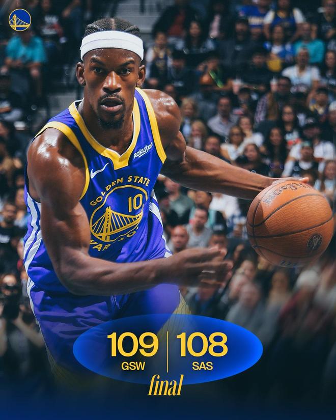 福克斯上篮得手,科尔请求暂停。巴特勒单打不进,文班亚马低位得分,瓦塞尔连续犯规,库里上篮得手。巴特勒、福克斯各有抢断,卡斯尔补篮得分。格林上篮打进,比赛进入白热化阶段。文班亚马补篮得手,巴特勒空切上篮得分,文班亚马中距离不进,随后大帽巴特勒。福克斯中距离打铁,随后还出现犯规,库里2罚全中。距离终场仅剩6.4秒,马刺落后1分并请求暂停。福克斯中距离不进,卡斯尔补篮打铁,比赛时间走完。最终,勇士以109比108险胜对手。